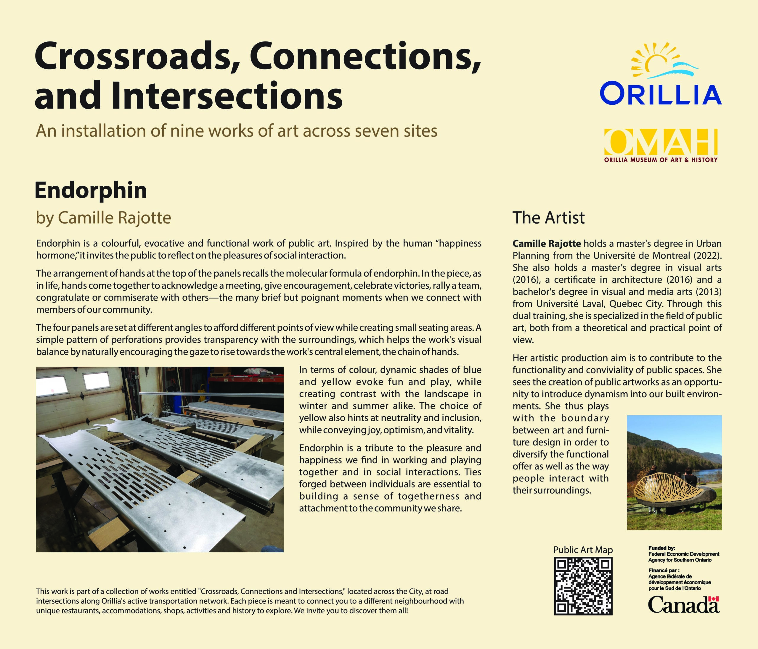 The City of Orillia Art in Public Places Strategic Plan is meant to provide the City and community with a roadmap for the funding, development and installation of public art that reflect the needs and stories of Orillia.
