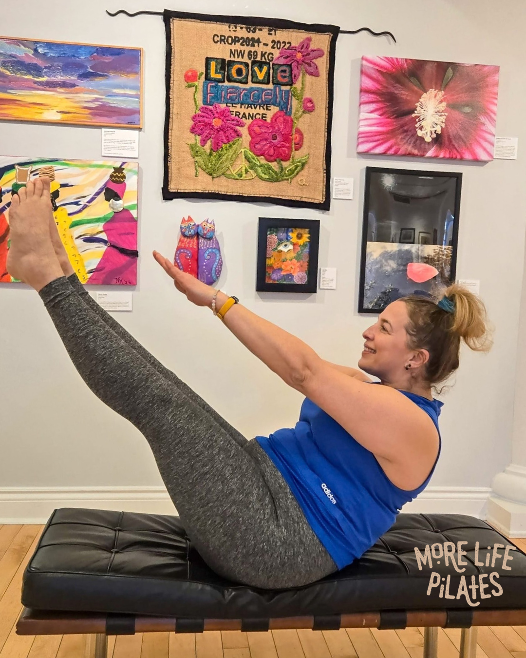 Practicing Pilates within the gallery space creates a peaceful and inspiring environment where movement, mindfulness, and art come together.